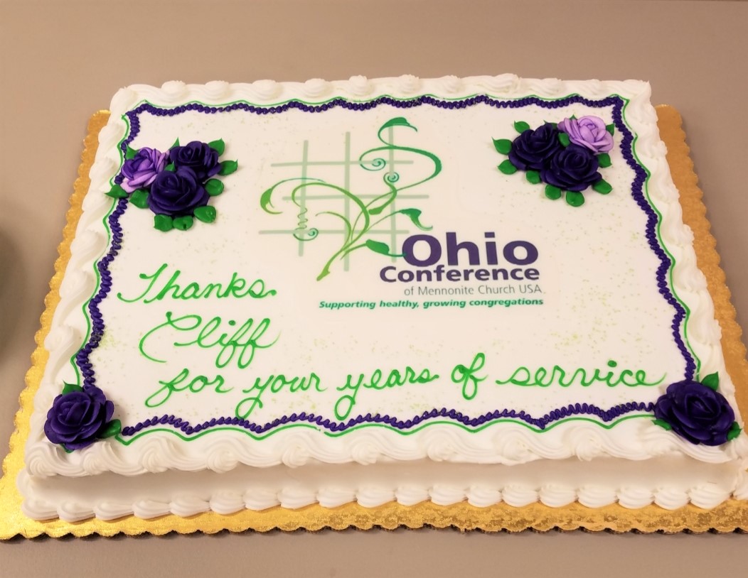 Time was spent giving thanks to Cliff Brubaker for his years of service as regional pastor and blessing him for his continued pastoral ministry at Zion Mennonite Church and as he explores the ministry of spiritual direction. Bruce Breckbill and the Kidron Everence office provided a cake.